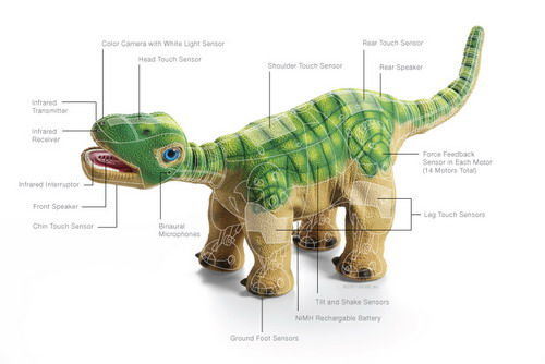 Pleo小恐龙的技术复杂度远高于一台笔记型计算机,内有八个计算机芯片、运算速度高达六千万次/秒,且内含三十八个传感器,用来侦测光线、动作、触摸、与声音等。这些息搜集起来,回传到中央微处理器系统。Pleo小恐龙内部配备十四个马达,因此,其动作可以完全独立自主行动、不需要遥控,就能够相当灵活流畅,四只脚可弯曲退后,也具有灵敏的触觉、视觉和听觉。《时代》杂志形容,Pleo是“有生命形态(Life form)的宠物”。只要主人回到家,Pleo会对主人摇头摆尾,给它轻轻地抚摸,它会高兴得摇尾巴,它会打喷嚏、打哈欠,搔它的背,它还会一百八十度回过头来,看是谁在跟它玩。
