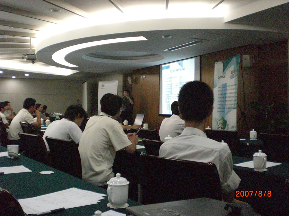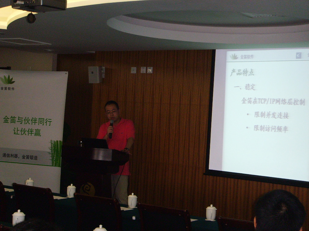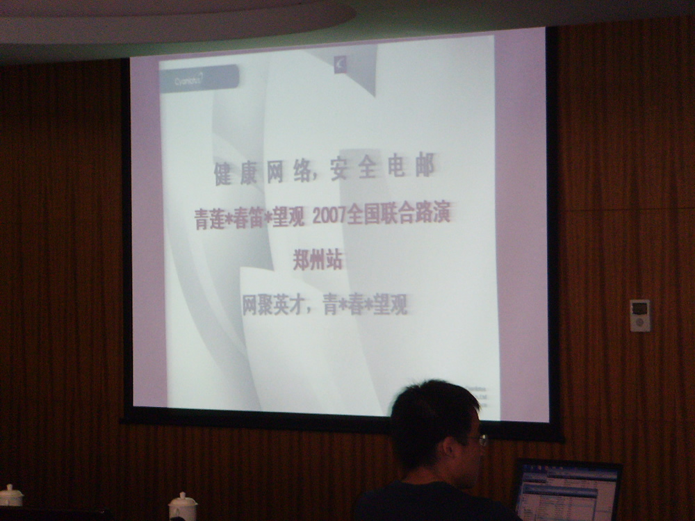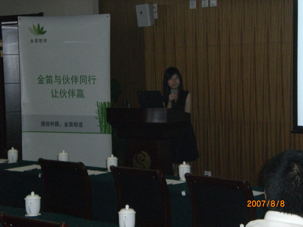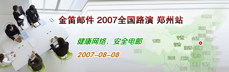 2007年8月8日,金笛邮件携手“青莲”及“望关”在河南迎来了2007年大型路演第二站――郑州站。下午2时许,大会现场人头攒动,高朋满座,热烈气氛足以与郑州的天气相媲美。到会企业及有意向的代理商共计四十余家。春笛公司的工程师为大家带来了目前国内先进的邮件技术讲解,并且为大家介绍了最新研发的金笛邮件系统功能。会议临近结束时,销售总监刘萌向大家介绍了春笛公司的发展规划及代理政策,“年销售额百万,宝马赠英雄”将大会推向了高潮。