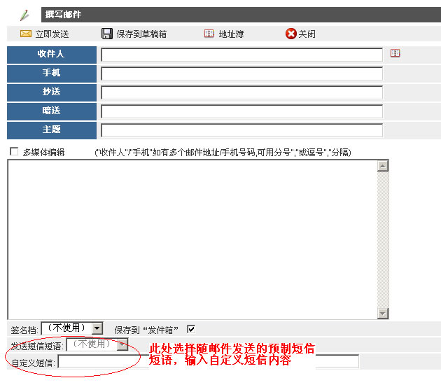 | 金笛邮件系统标准版、企业版内嵌短信功能,只要加一个金笛GSM/GPRS猫即可实现有新邮件之后,发短信提醒,还可以在发送邮件的同时,给对方发一个短信。