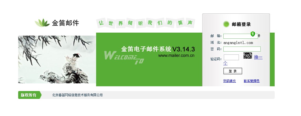 鞍钢集团国际经济贸易公司于2010年购买金笛邮件系统,邮件系统应用于内外网,国内外邮件的收发,其中国外发信通过我公司提供的中继服务往国外发送邮件,使用顺畅。目前已升级更新到3.14.3版本,邮件系统登陆界面: