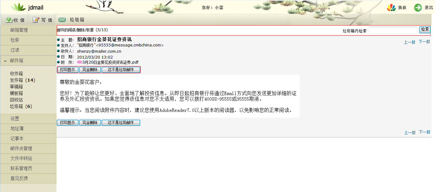垃圾箱也增加邮件未读加粗功能;上端功能按钮和下端对称;邮件大小数字居中显示等。效果图如下: